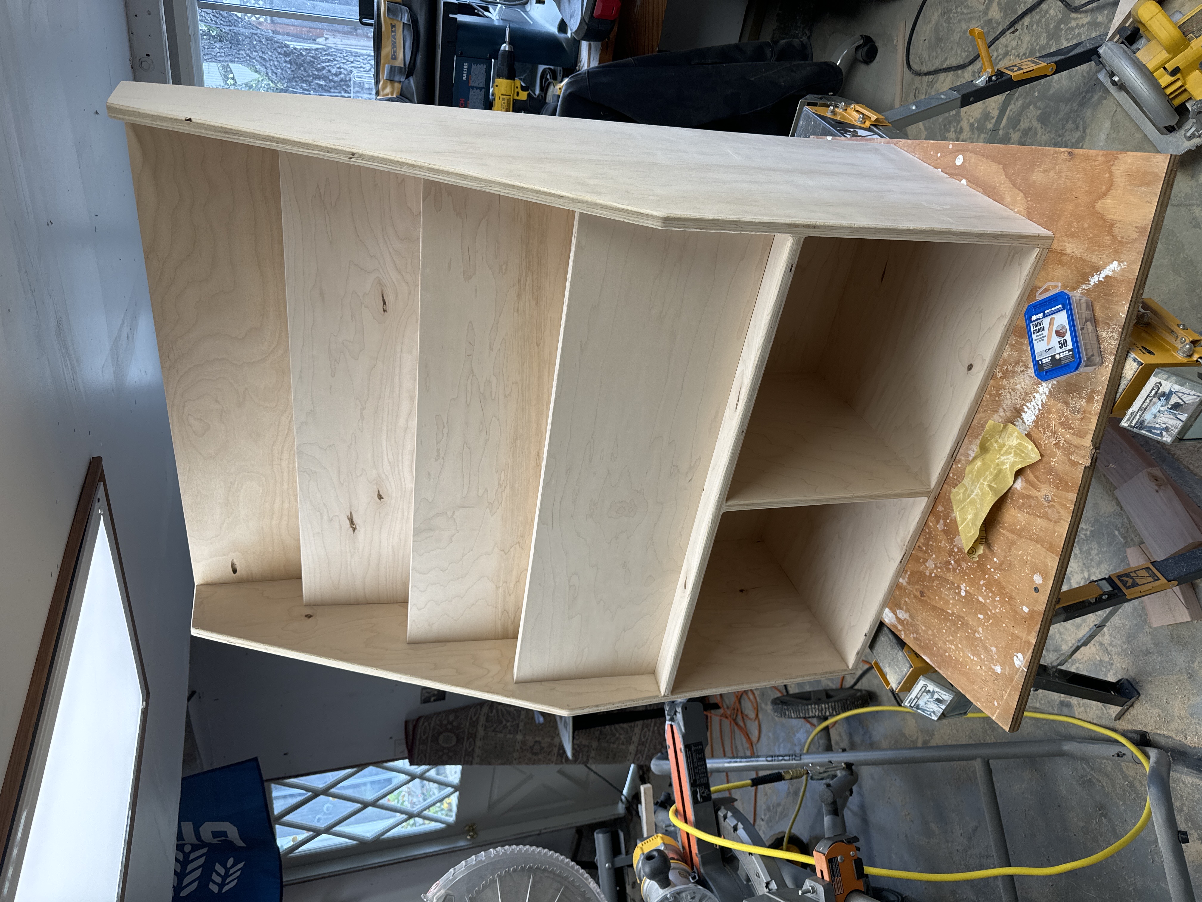 This is a bookcase I made for my son to hold his books in a way he could both see them and get them easily. This is all made from plywood and (gasp) pocket holes. I tried to make the cubbies at the bottom the same size as the IKEA Kallax ones but missed the mark. They still hold things well, though!