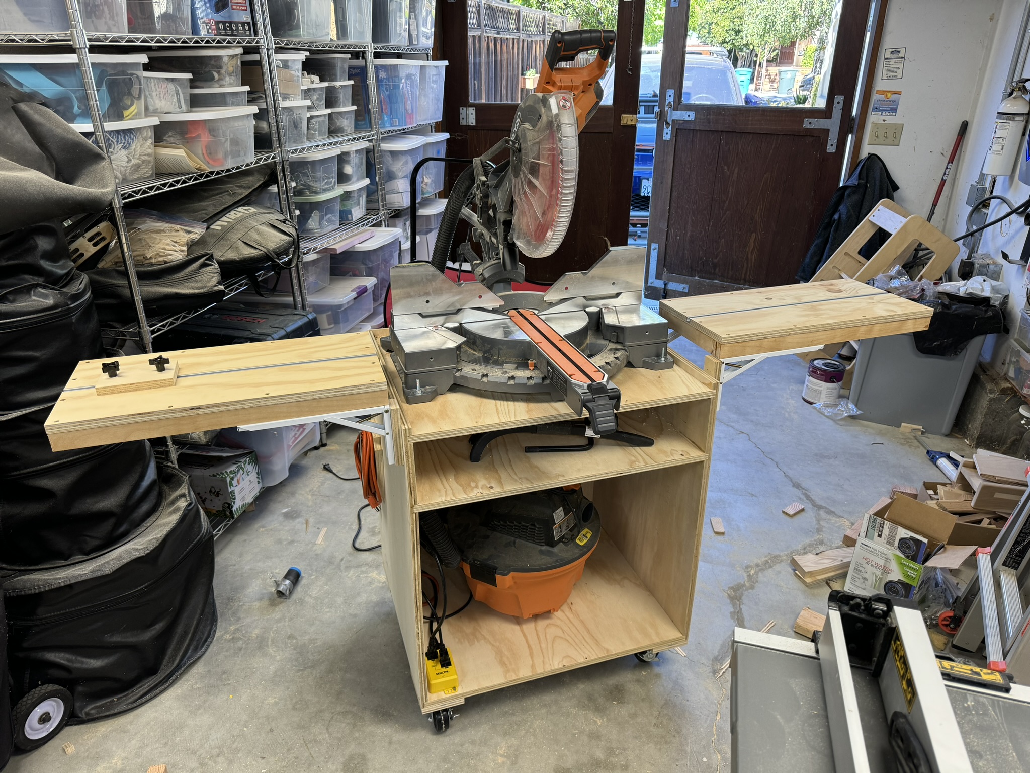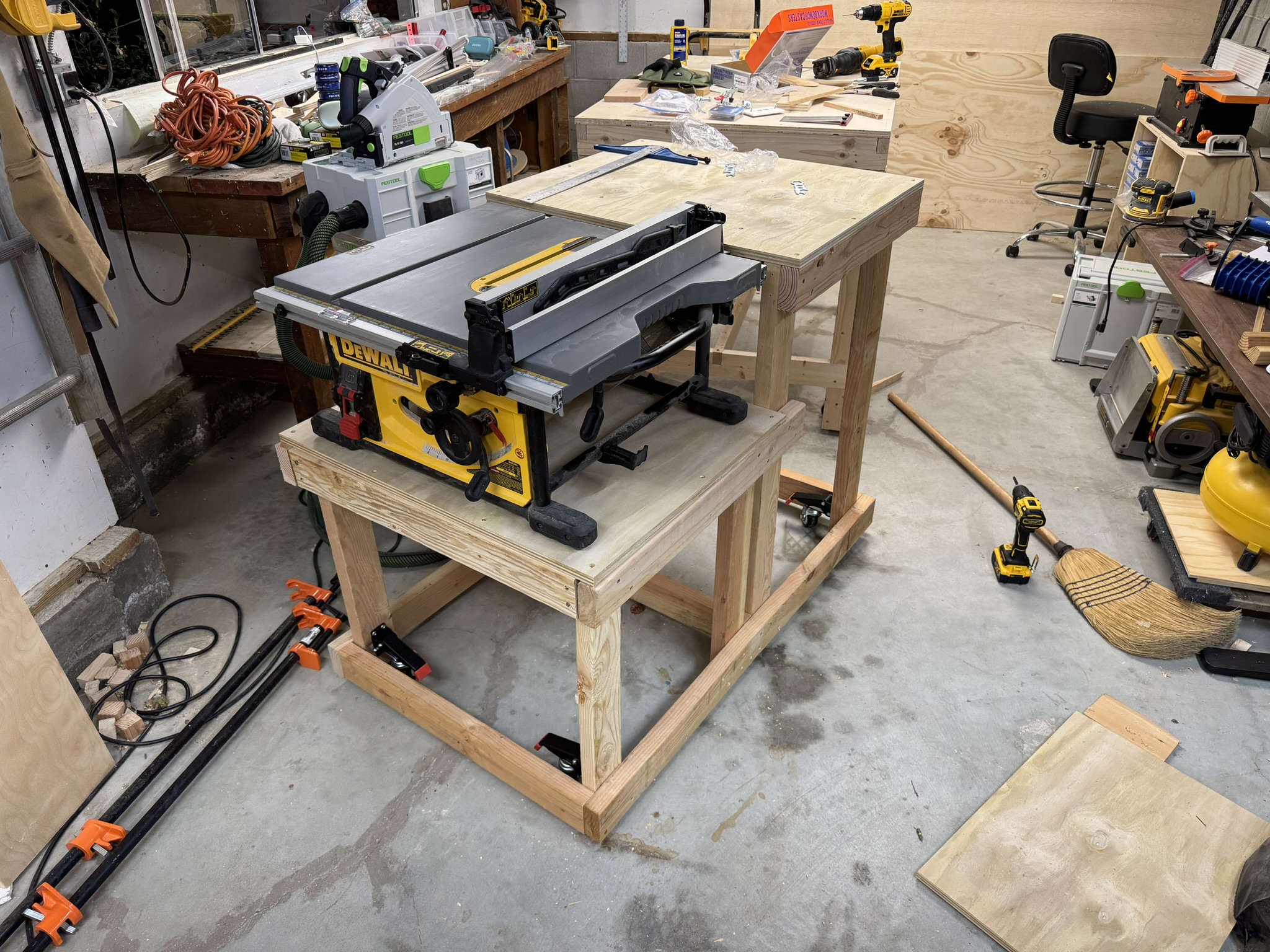 This is one of the first custom stands I built. Before this I had all my tools on standard jobsite stands that folded up and it was an absolute nightmare to work in the shop. The jobsite stands also don’t have outfeed tables. This table was a real game-changer for me as it gave me both an outfeed table and a mini assembly spot.