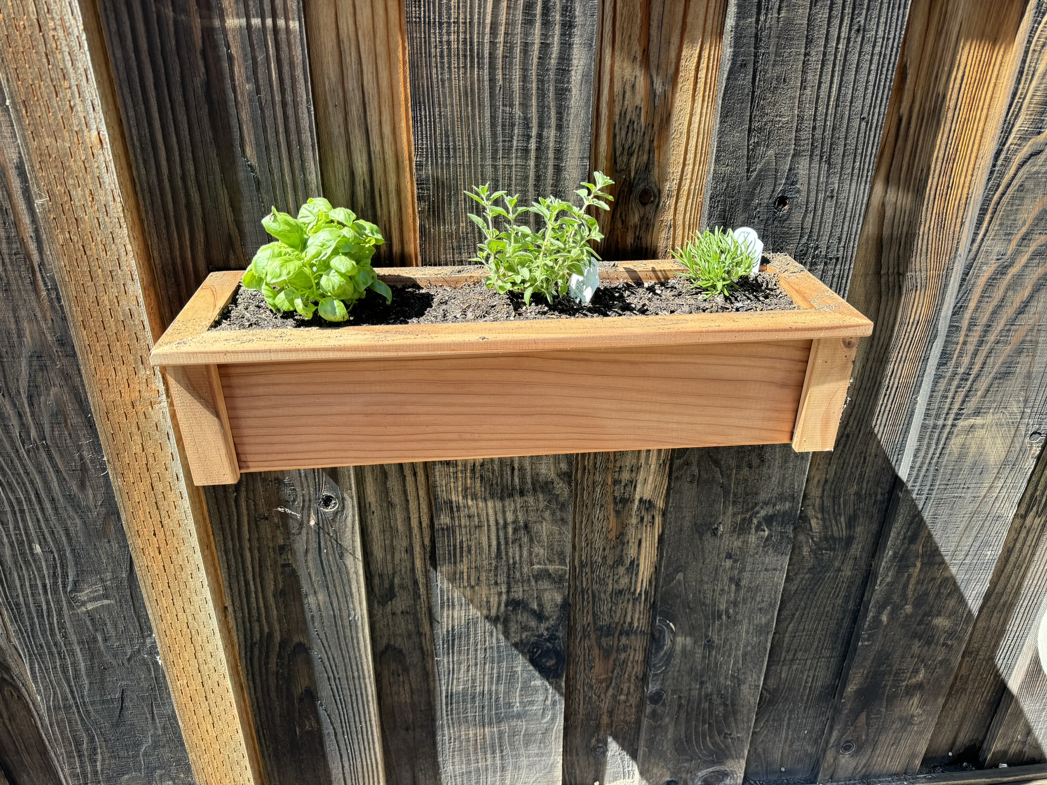 I made this for my wife to grow herbs on our fence. It’s made of redwood planks from Home Depot and a lot of rabbets. I attached it to the fence with a French cleat but that ended up being a bad idea. It needed something with more purchase to hold the weight of dirt, rocks, and water.