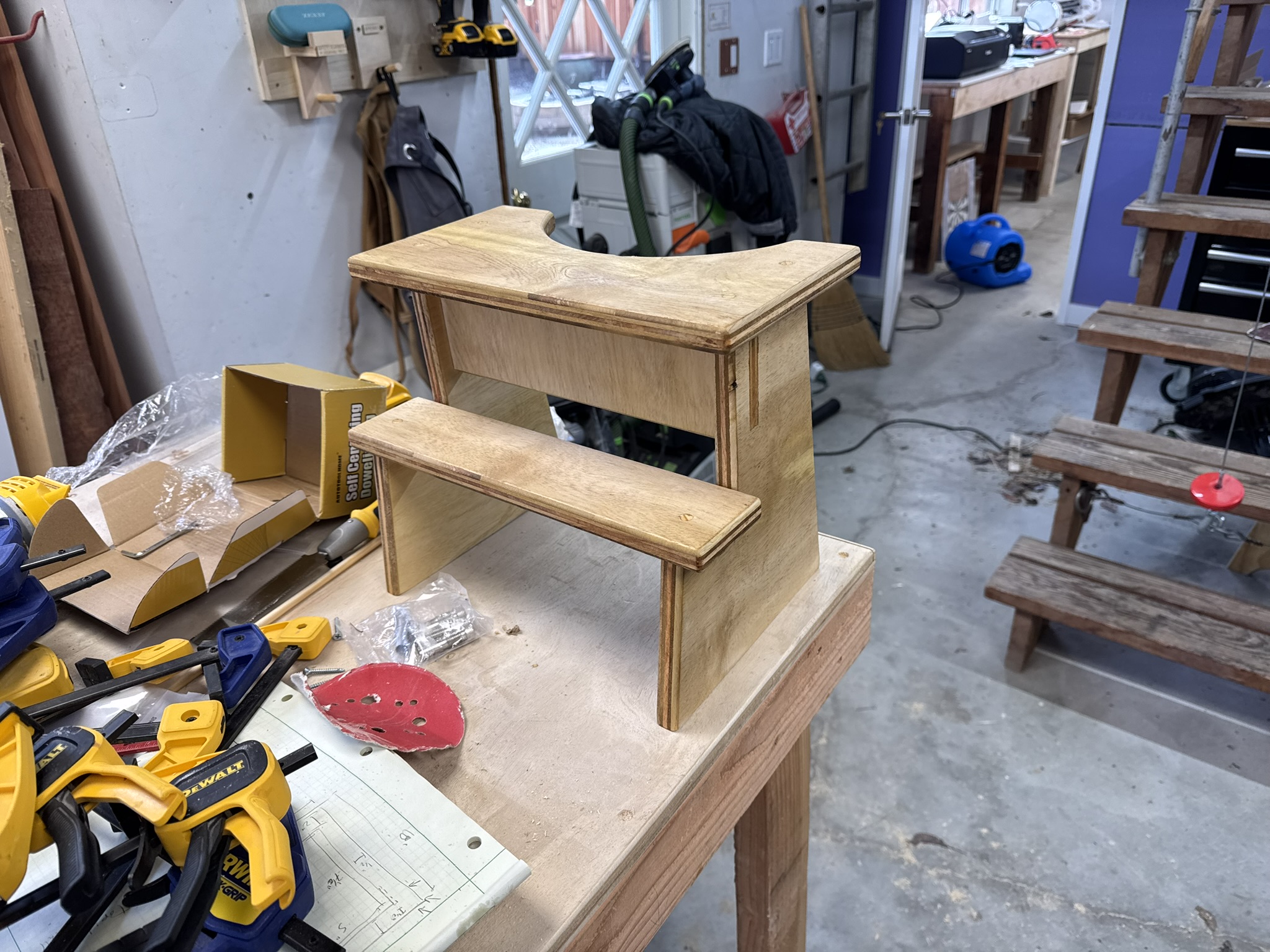 My kiddo needed a stool to use when he was going to the bathroom (he’s potty training, yay). I made him this two-step guy with no fasteners (mortise-and-tenon plus dowels) which is cool, but in hindsight I should’ve made the two steps much wider. It’s hard for him to get up and down the steps given the tight fit.