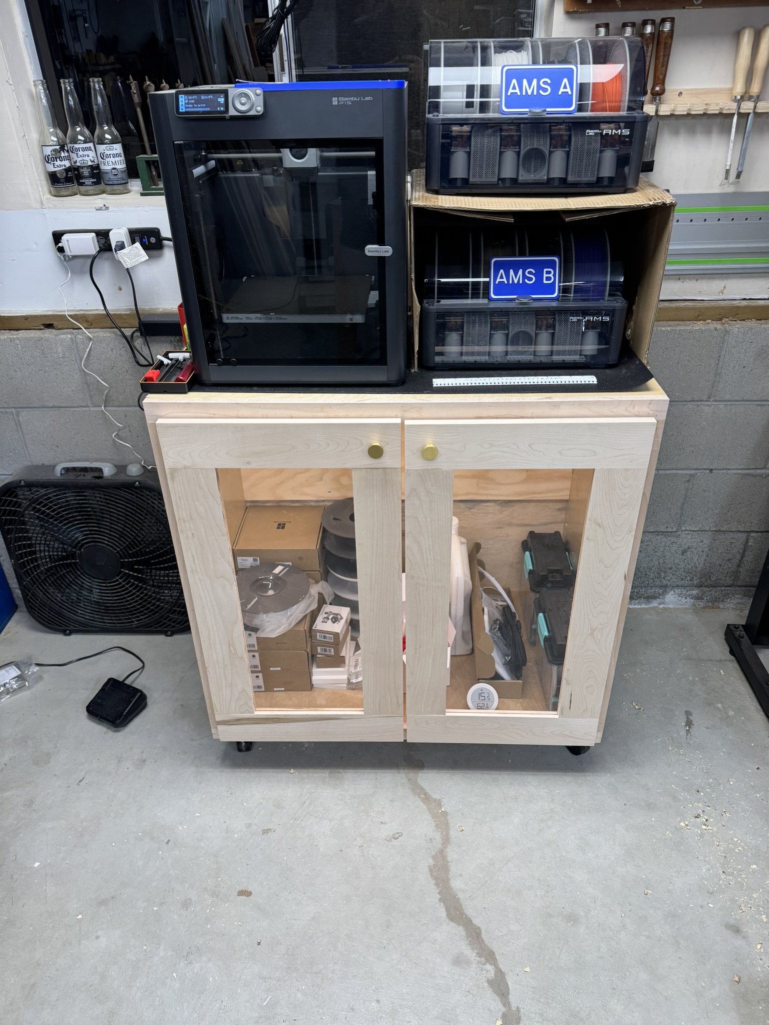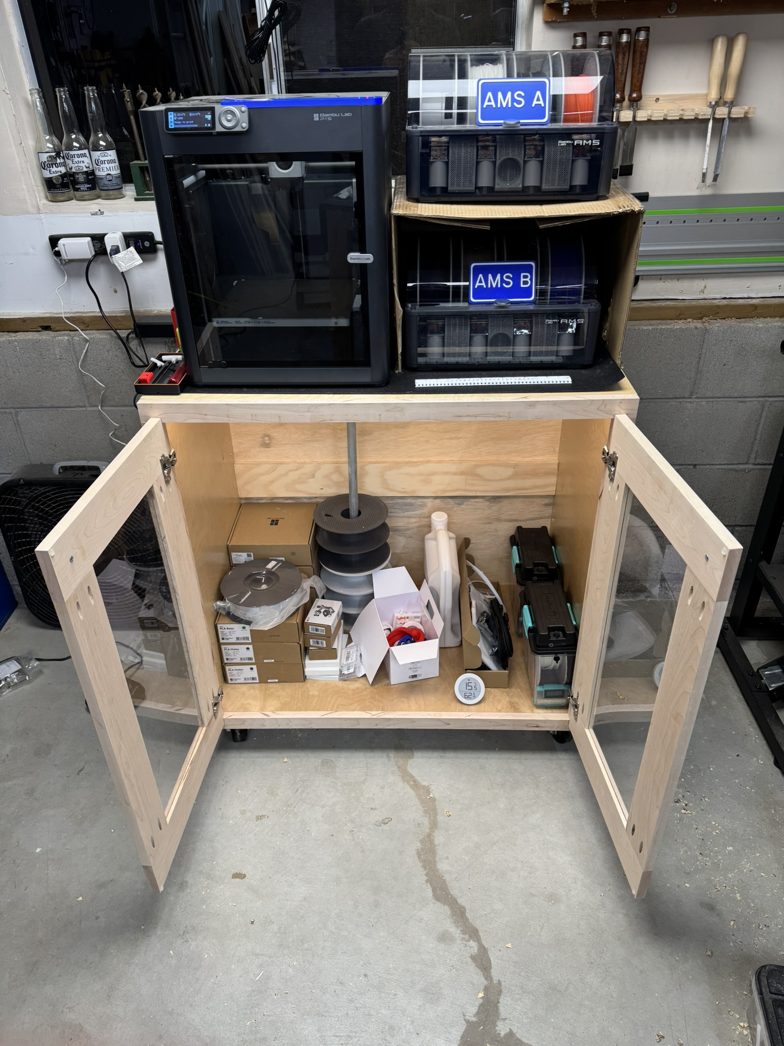 I got a Bambulabs P1S last Fall and needed a stand for it (and its AMSs). I put a simple cabinet together for it and screwed some doors on with acrylic windows.