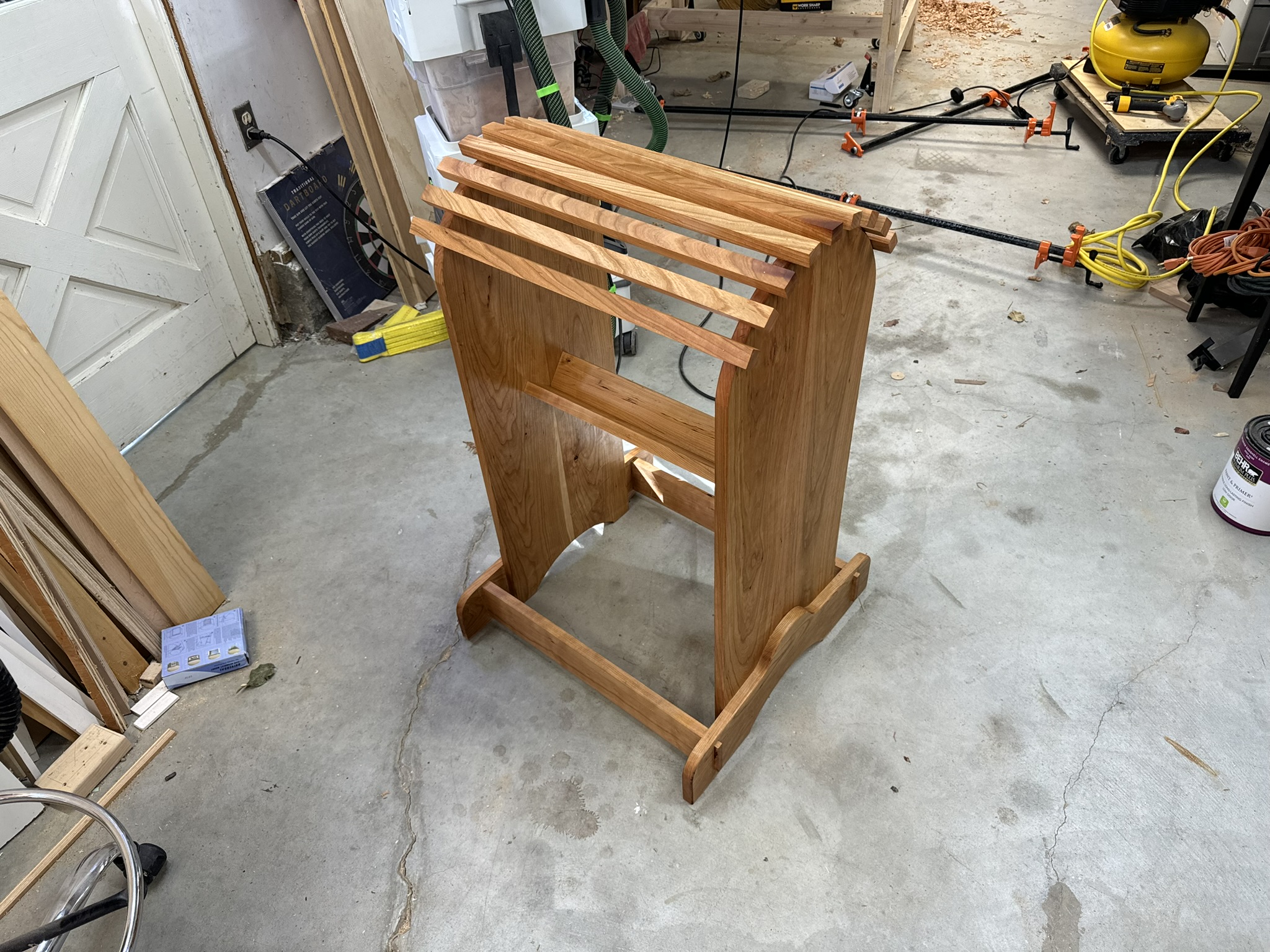 This is a piece for a friend’s family memorial. It was lots of fun to make, but scary as it’s hardwood (cherry) instead of ol’ reliable plywood. It now lives with that friend holding a departed loved one’s saddle.